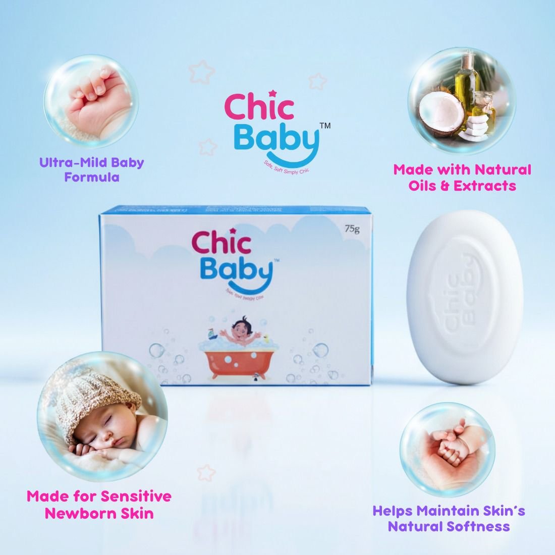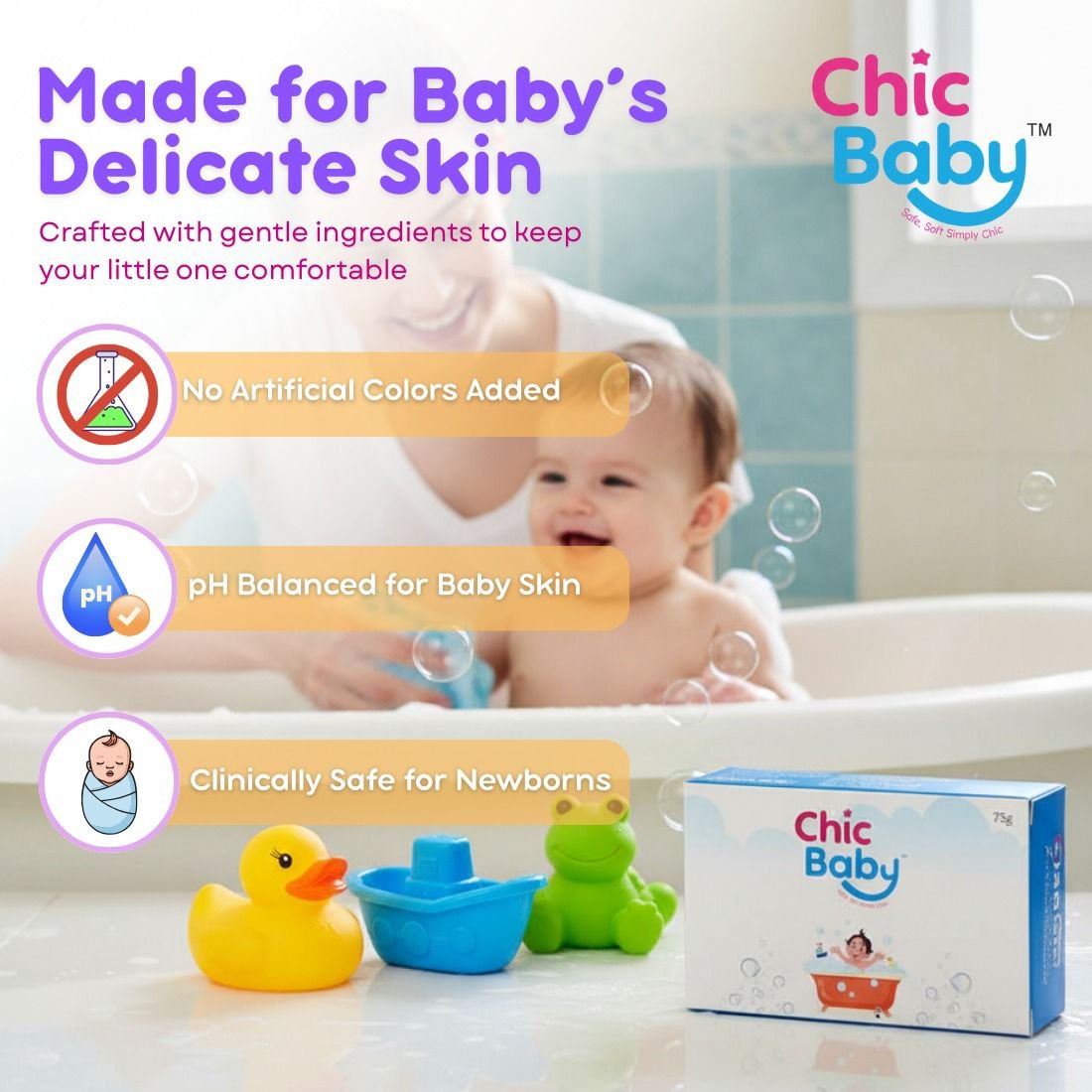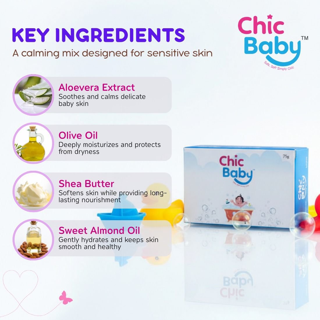 Chic Baby Soap is specially formulated to gently cleanse your baby’s delicate skin without stripping away natural moisture. Enriched with skin-loving ingredients like Aloe Vera Extract, Olive Oil, Shea Butter, Sweet Almond Oil, and Vitamin E, it helps keep your baby’s skin soft, smooth, and healthy after every bath.